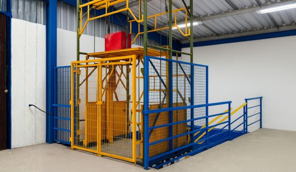 Industrial elevators for transporting raw materials, work-in-progress, and finished products in manufacturing facilities.